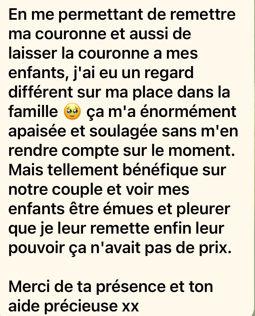 De ton côté, tu pourras, en TOUT TEMPS te déposer par écrit ou vocalement afin de me partager ce que tu vis.