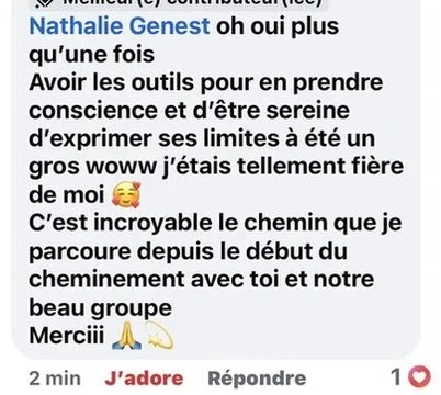 Je suis membre de l’Association des Naturothérapeutes du Québec, je peux donc t’émettre des reçus pour les rencontres privées en présentiel ou via zoom seulement.
