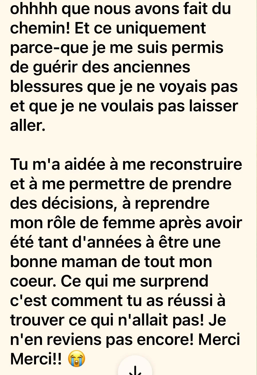 Parce que je ne te donne pas un cadre tout fait. Je t’écoute, je te vois, et je t’aide à te voir telle que tu es.